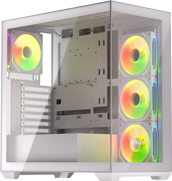 Krux Exo jest fabrycznie wyposażony w zestaw komponentów, które dadzą ci tonę frajdy z personalizacji. Po pierwsze, znajdziesz w nim cztery preinstalowane wentylatory 120 mm z ARGB. Po drugie, całość od razu wyposażona jest w splitter do sterowania podświetleniem poszczególnych elementów osobno. A na zamknięcie tego dobrego zestawu – przycisk pozwalający zmienić preset podświetlenia bez potrzeby ingerencji przez aplikację. Czego więcej trzeba, żeby było ładnie?