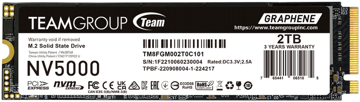 Ексклюзивна, запатентована TEAMGROUP графенова етикетка, що відводить тепло, ефективно знижує робочу температуру, забезпечуючи стабільну продуктивність SSD-диска. Сумісний з новітніми платформами Intel і AMD, SSD-диск NV5000 ідеально підходить як для настільних комп'ютерів, так і для ноутбуків.